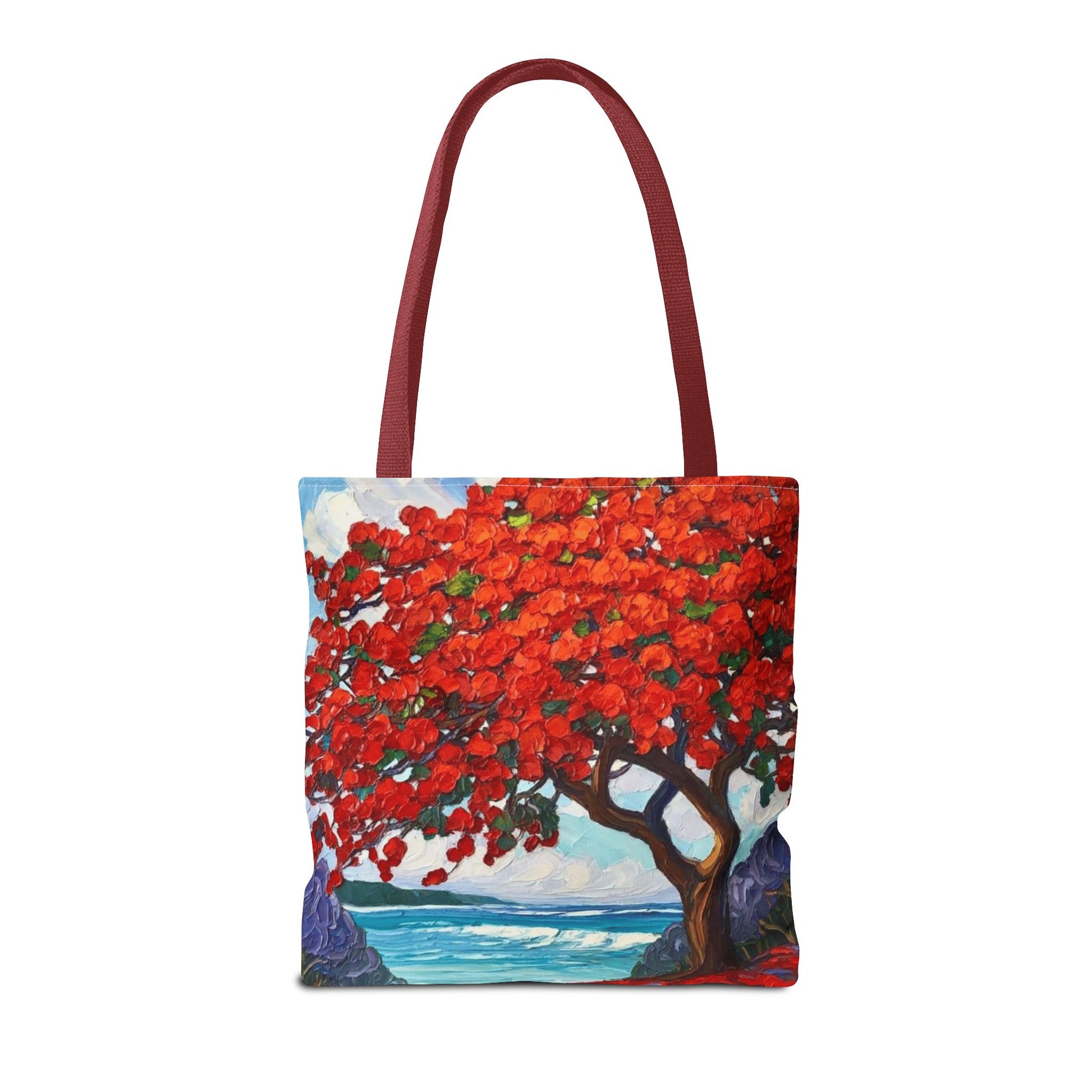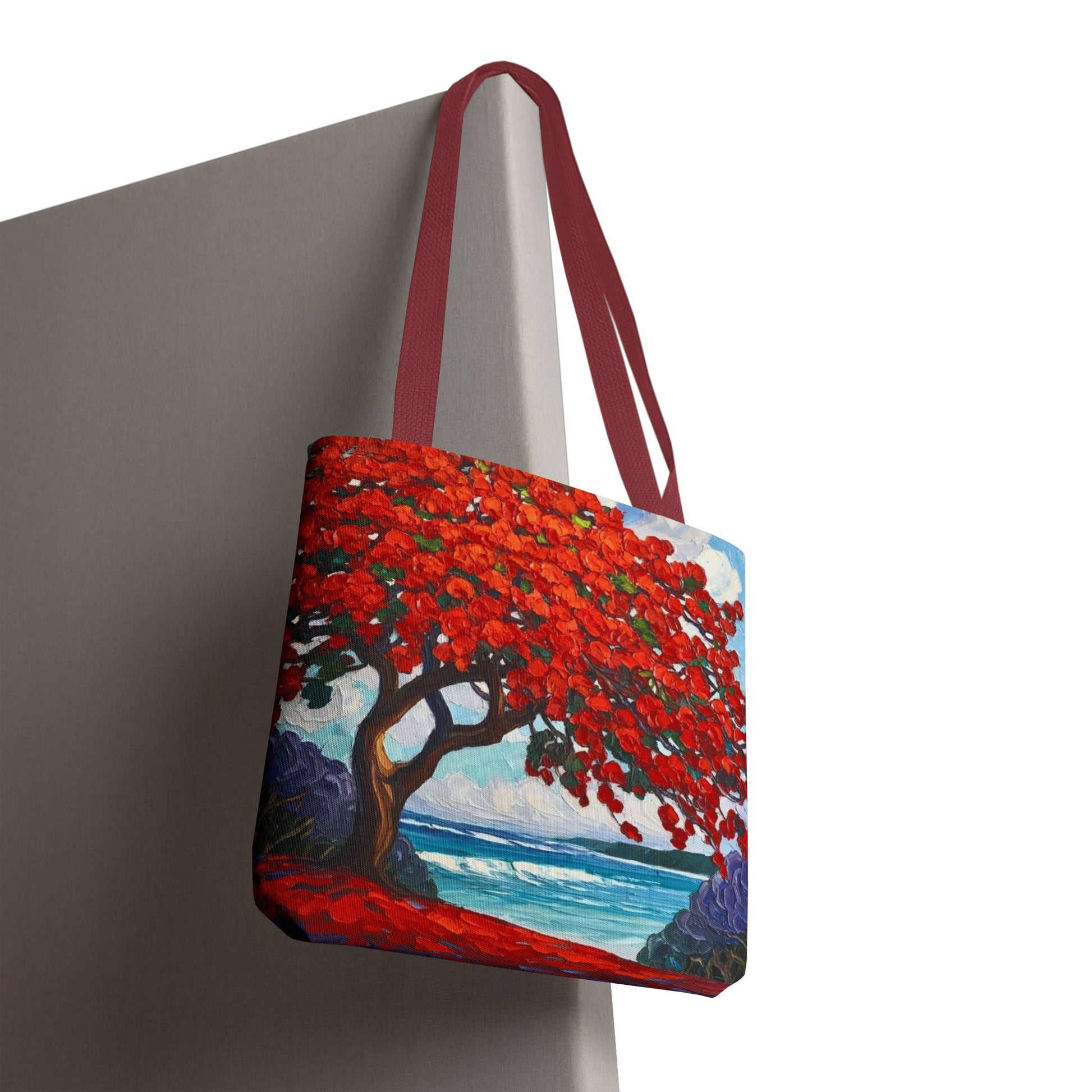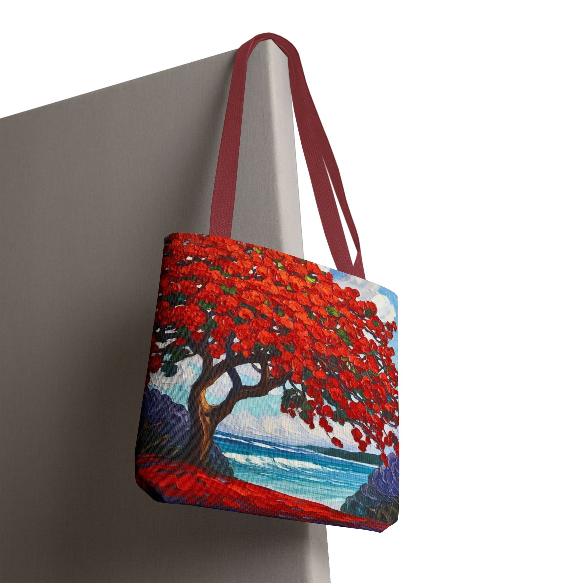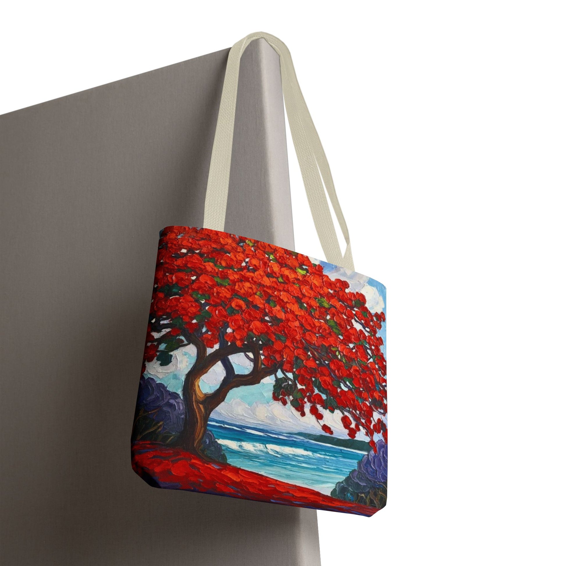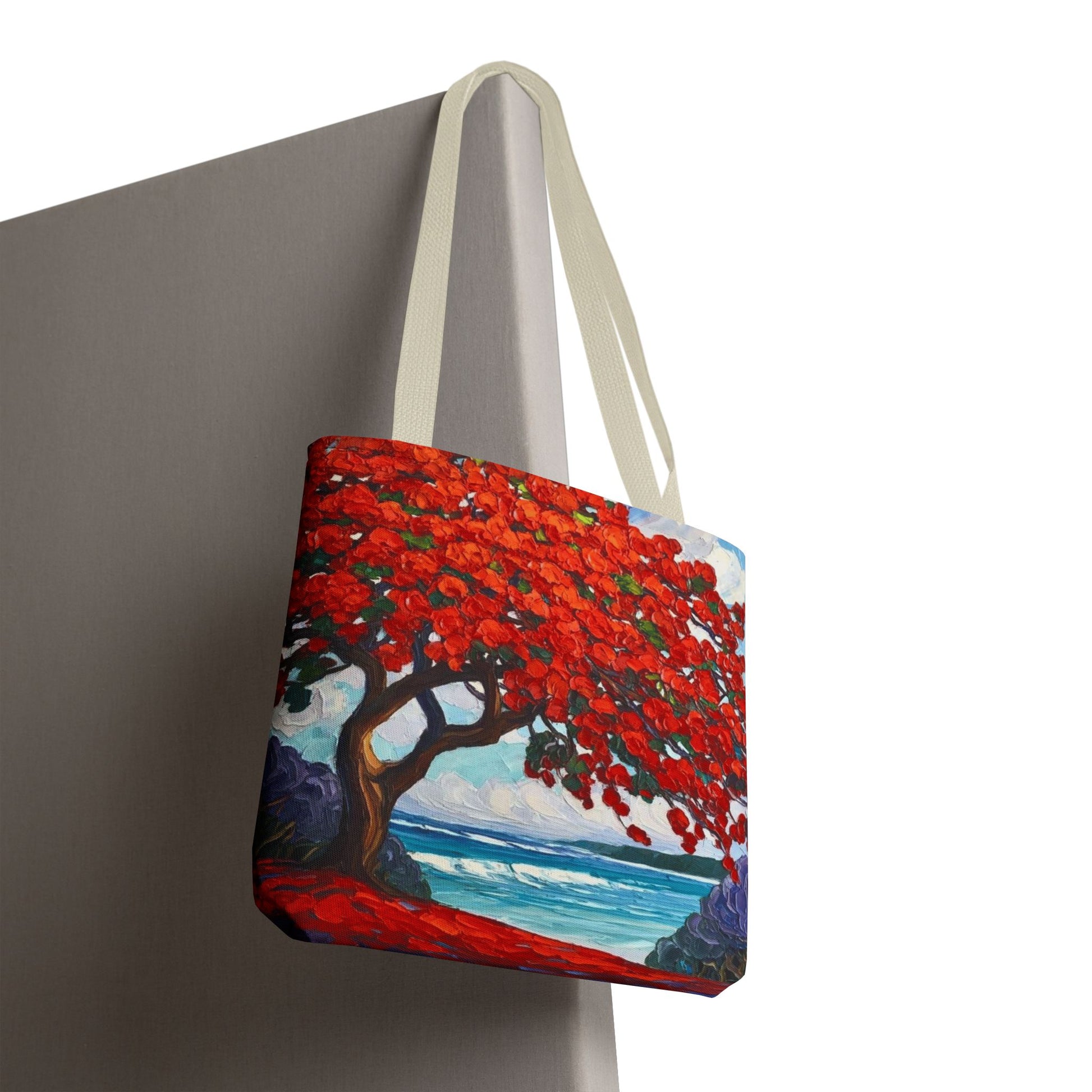 Red Blossom Beach Tote - Tropical Tree Art All-Over Print Tote Bag Crochet-Decorated Tote Bags