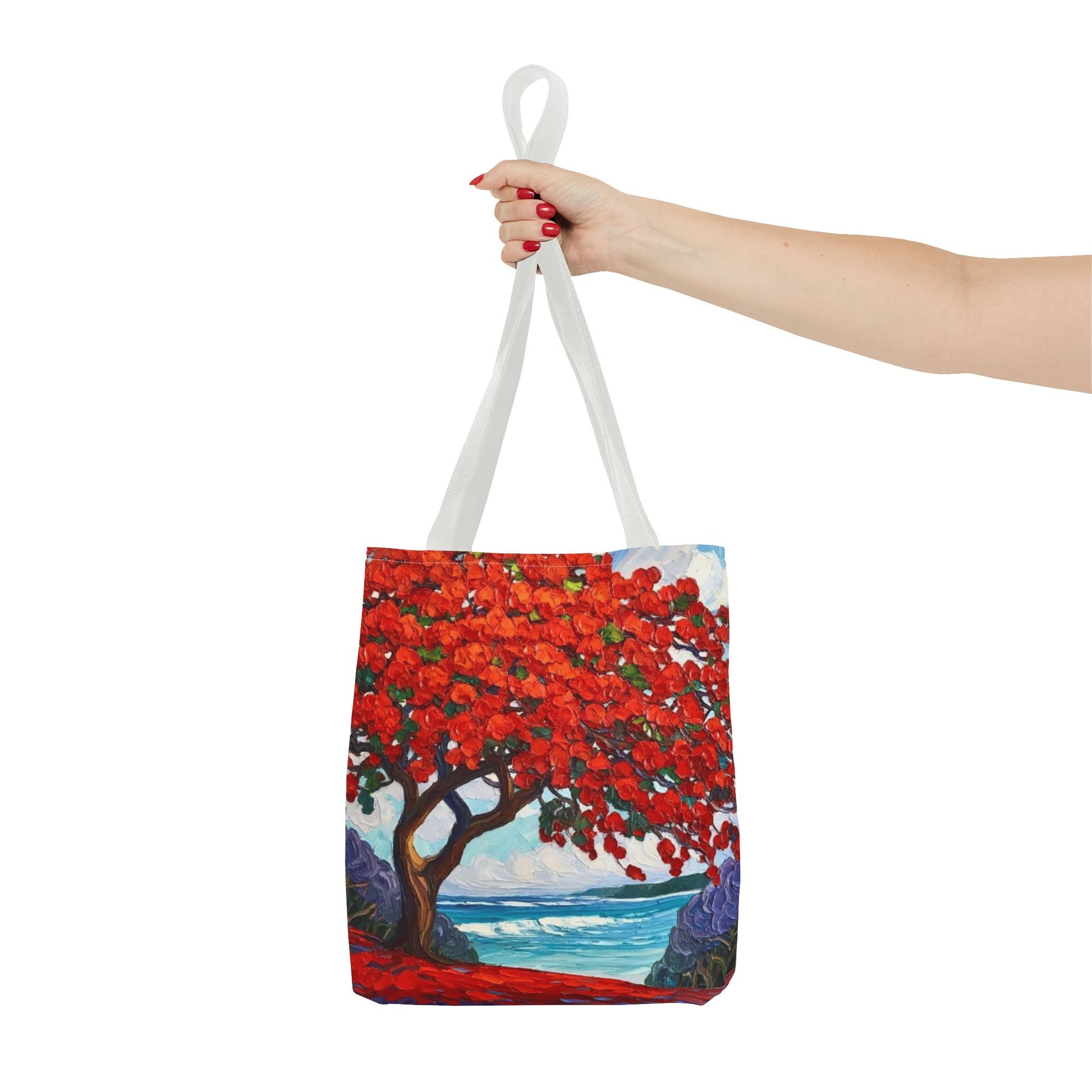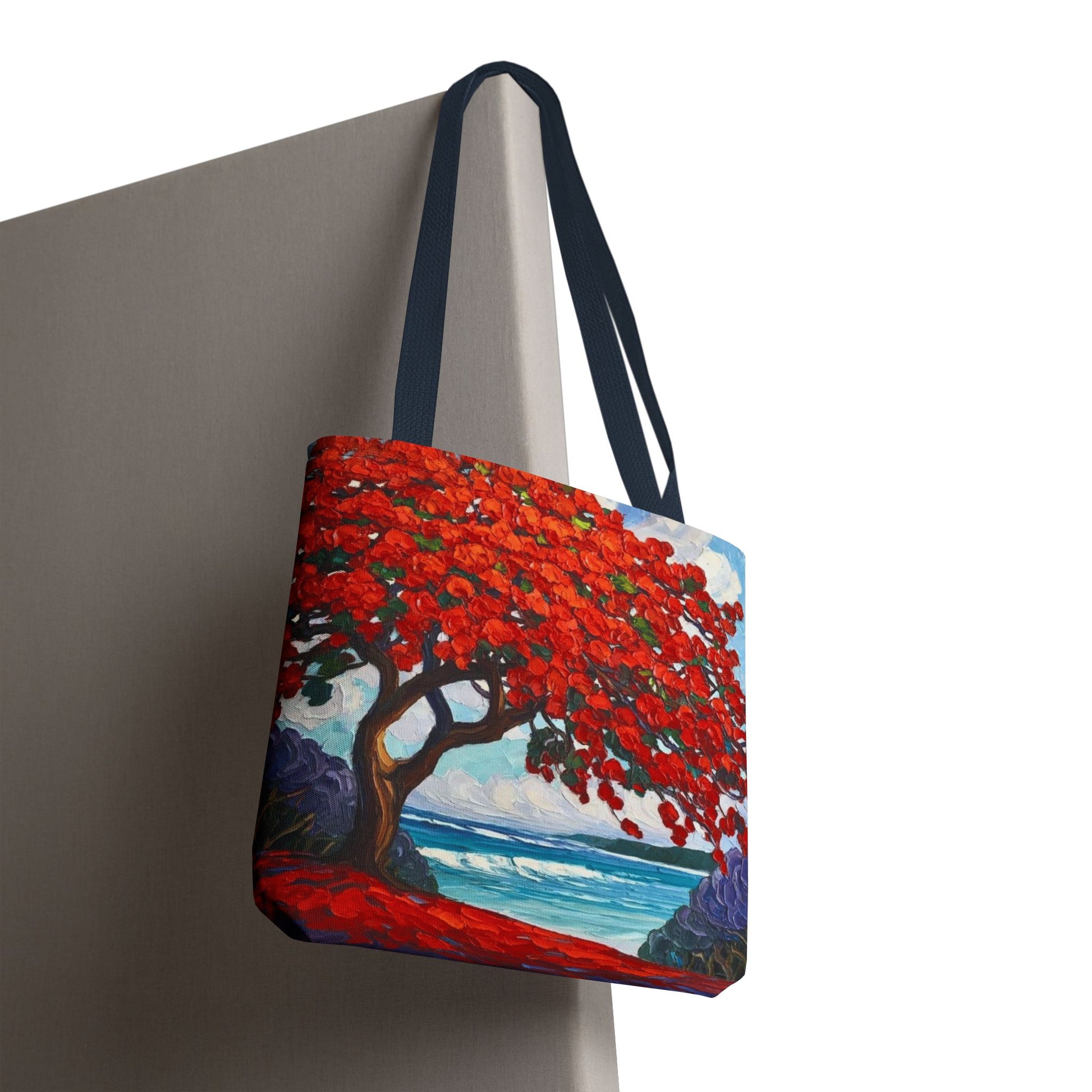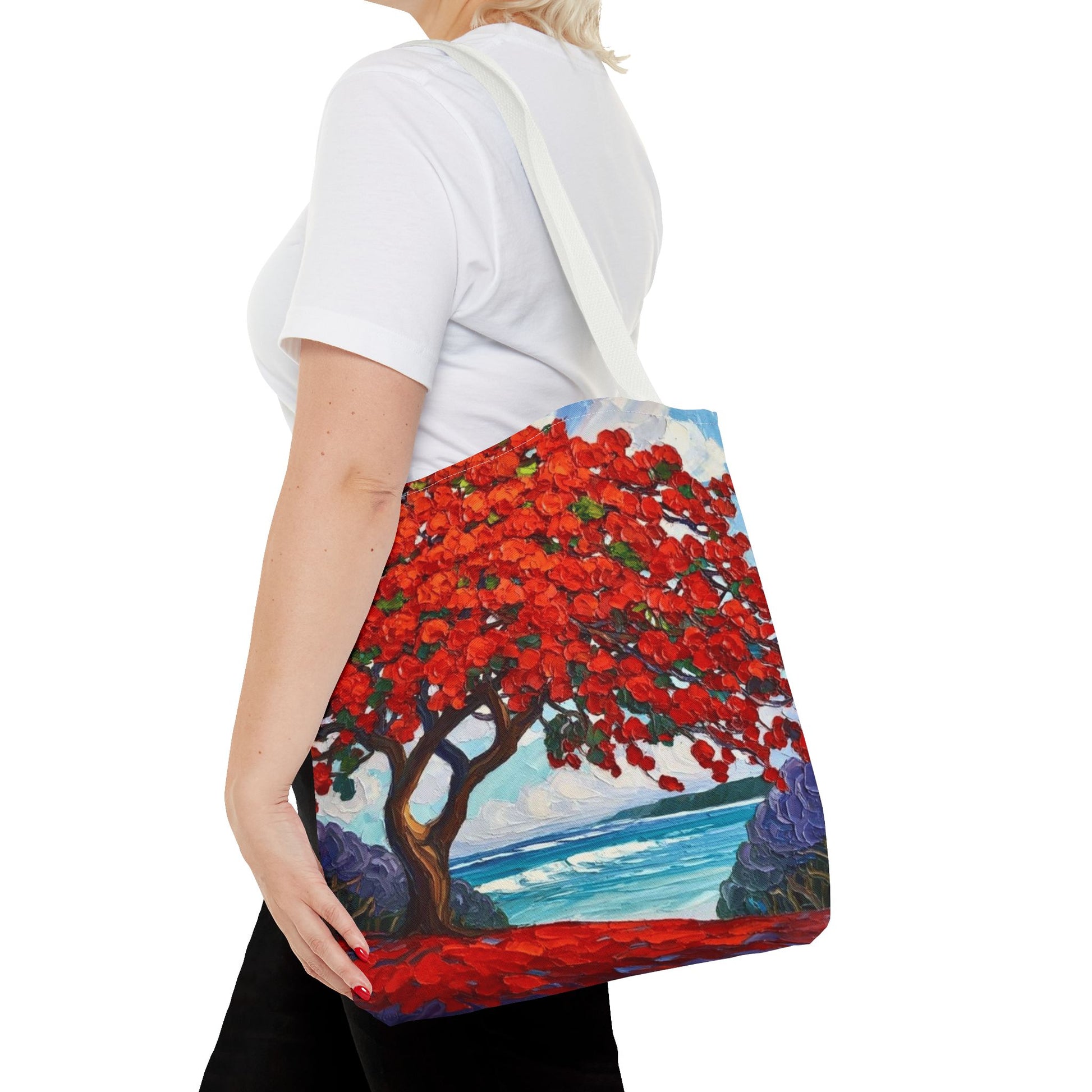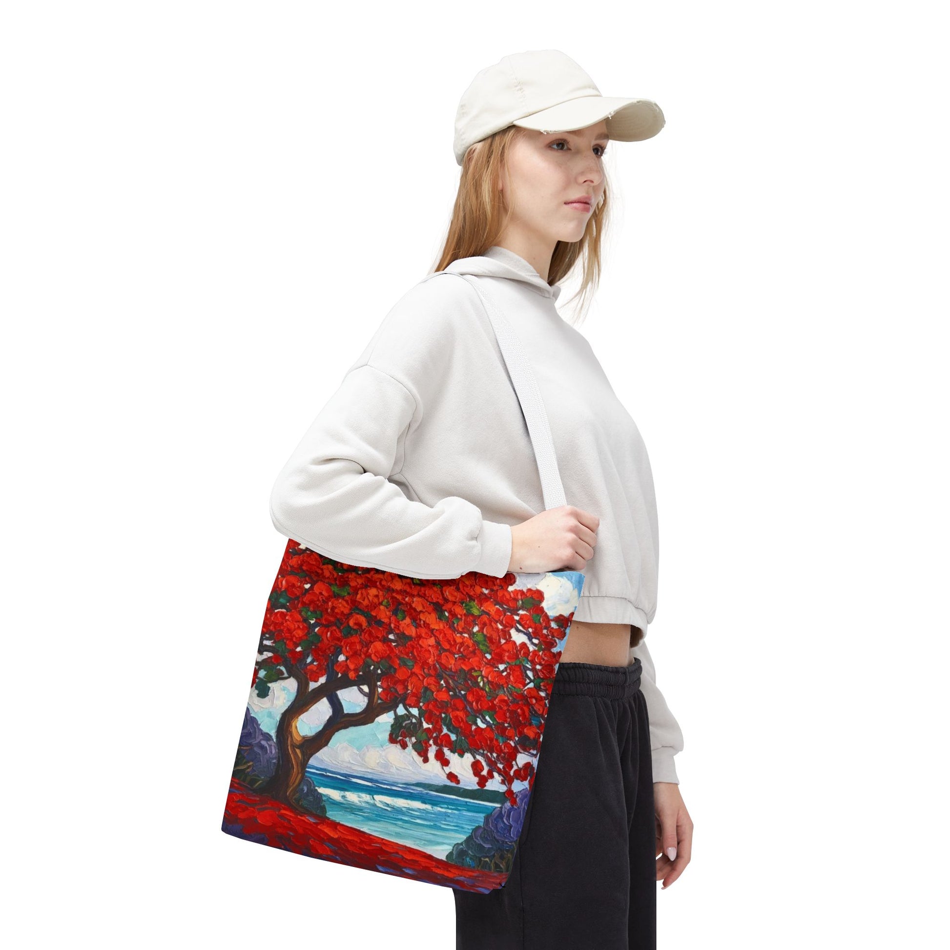 Red Blossom Beach Tote - Tropical Tree Art All-Over Print Tote Bag Crochet-Decorated Tote Bags