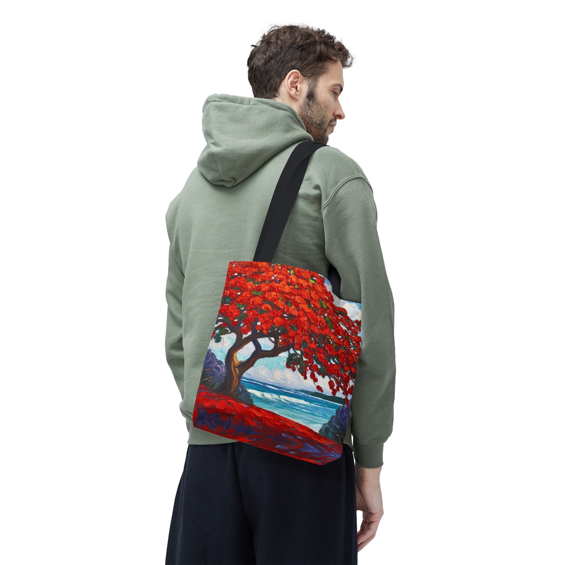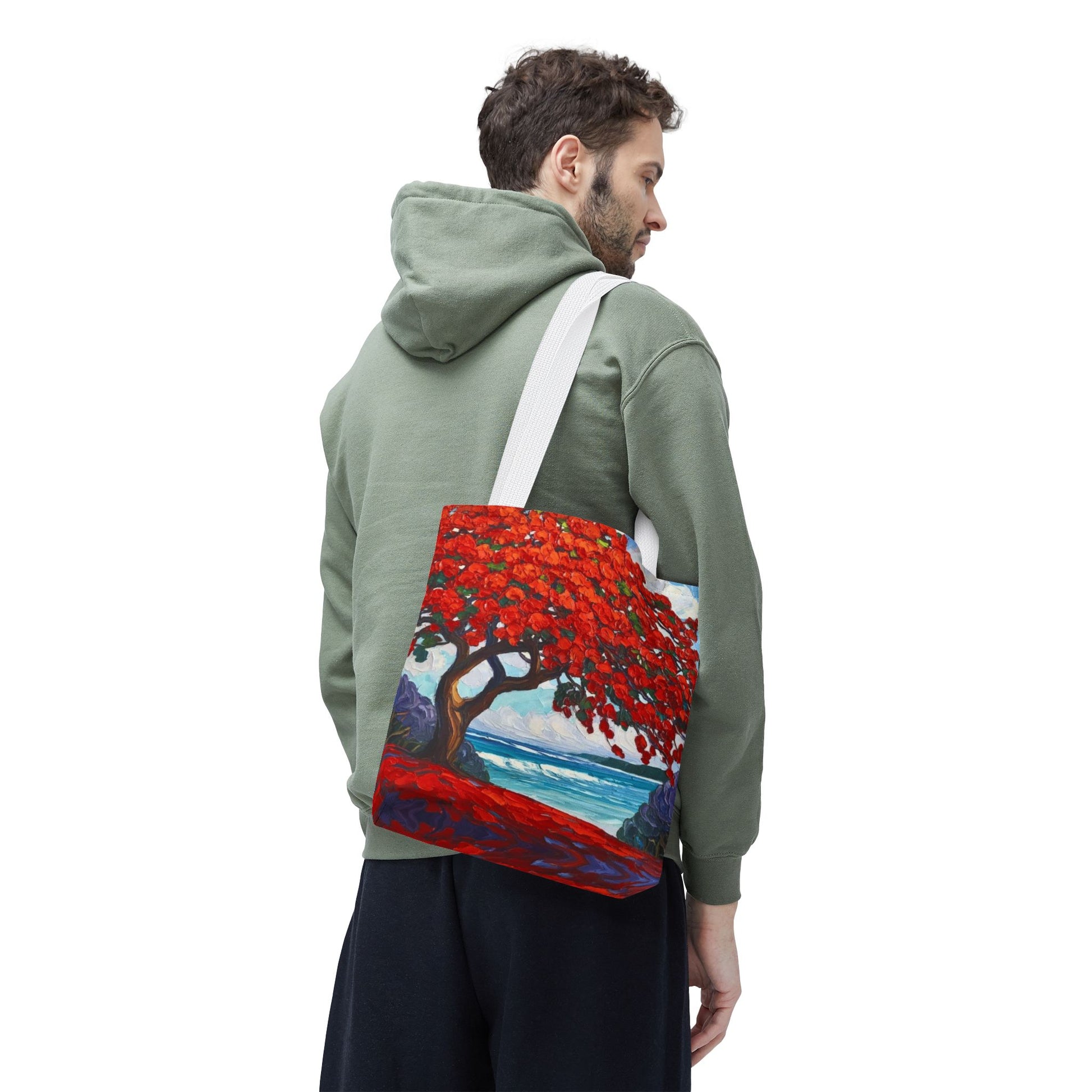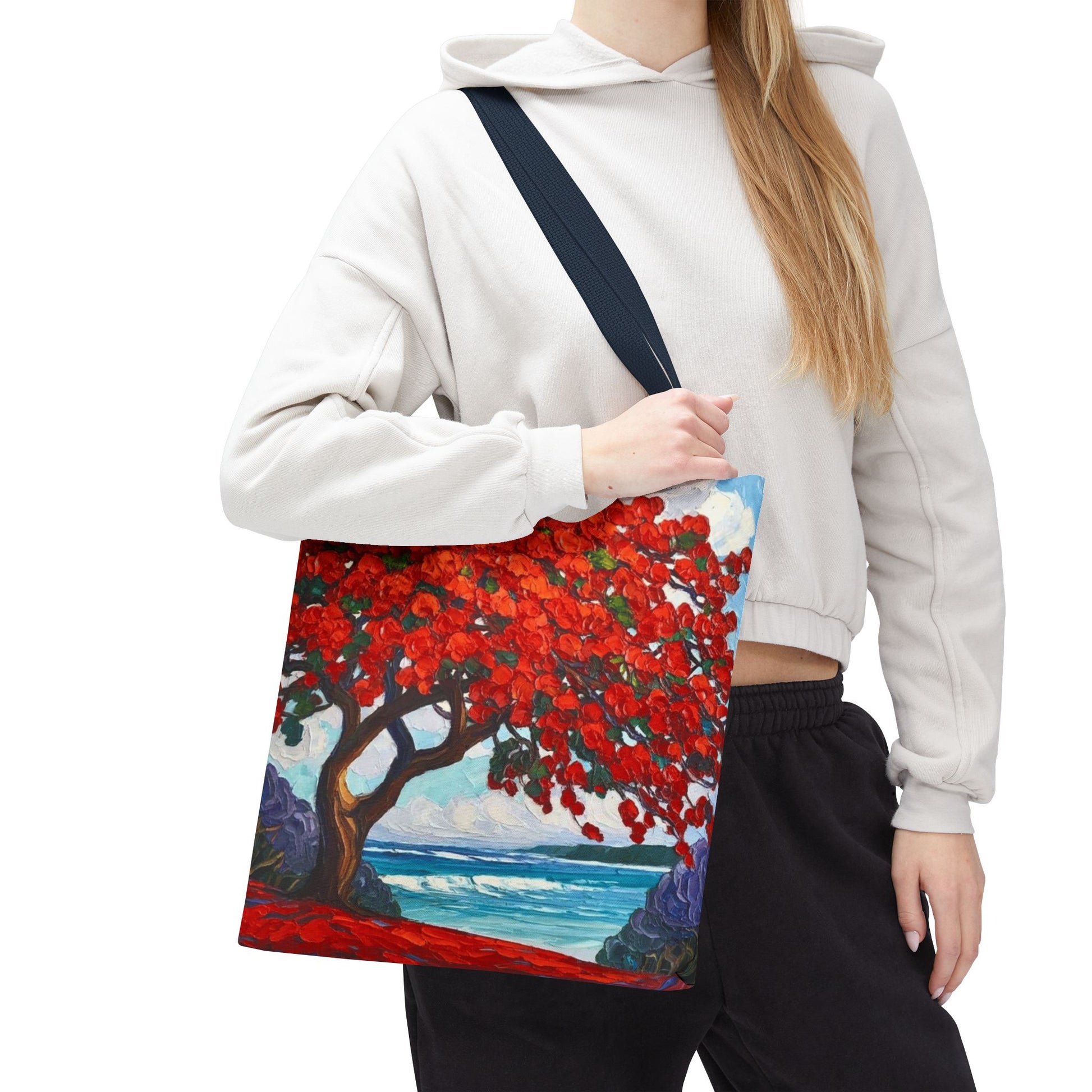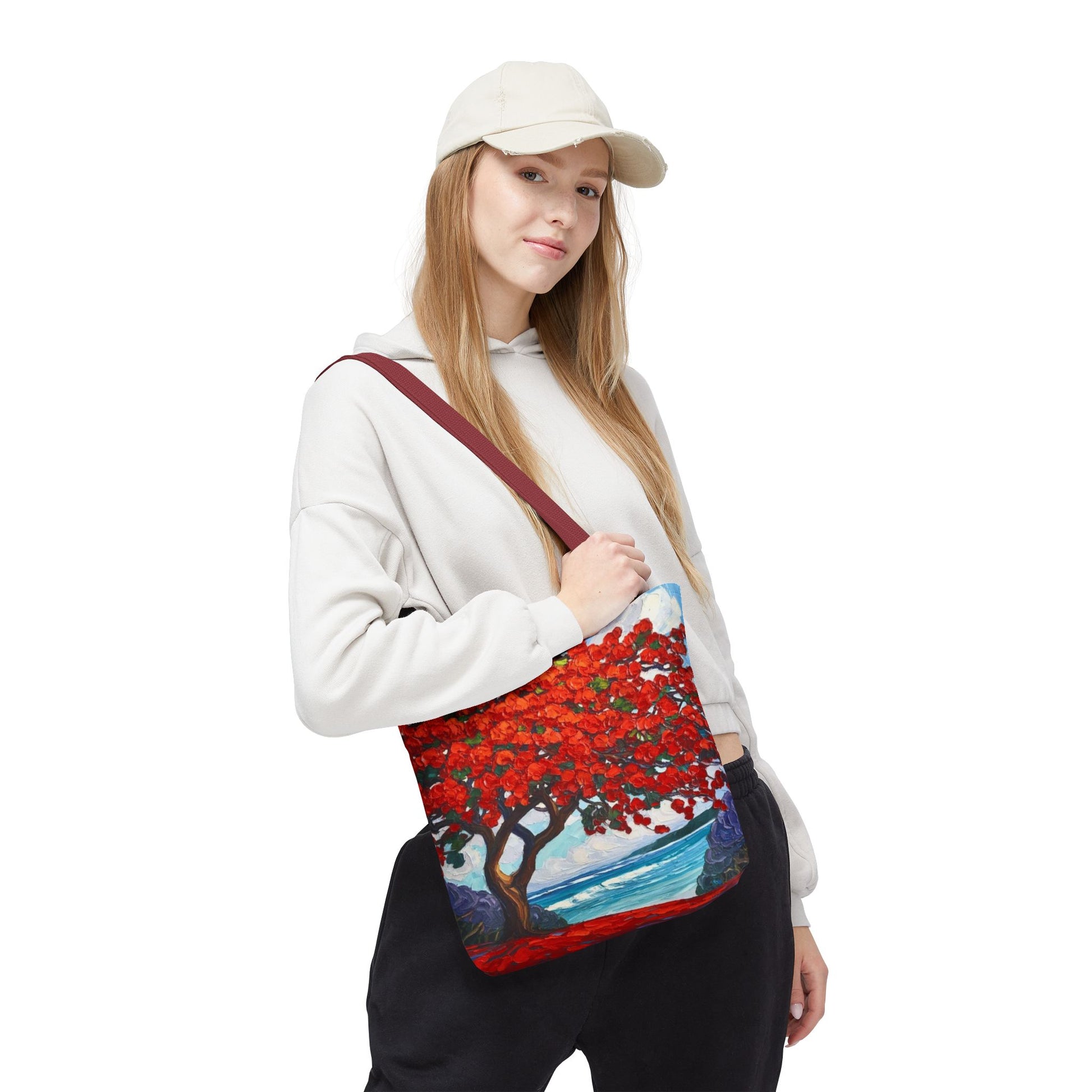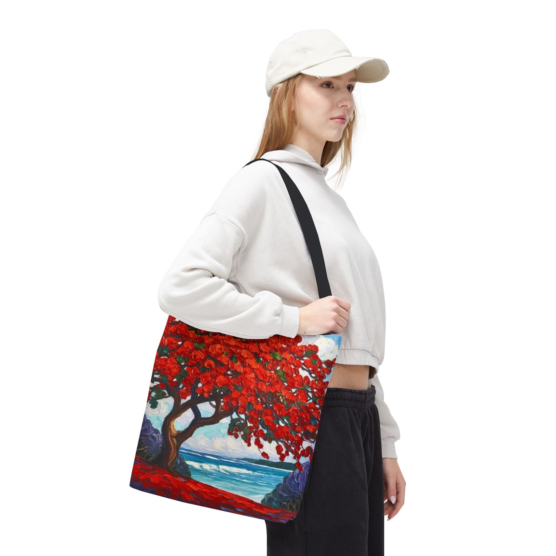 Red Blossom Beach Tote - Tropical Tree Art All-Over Print Tote Bag Crochet-Decorated Tote Bags