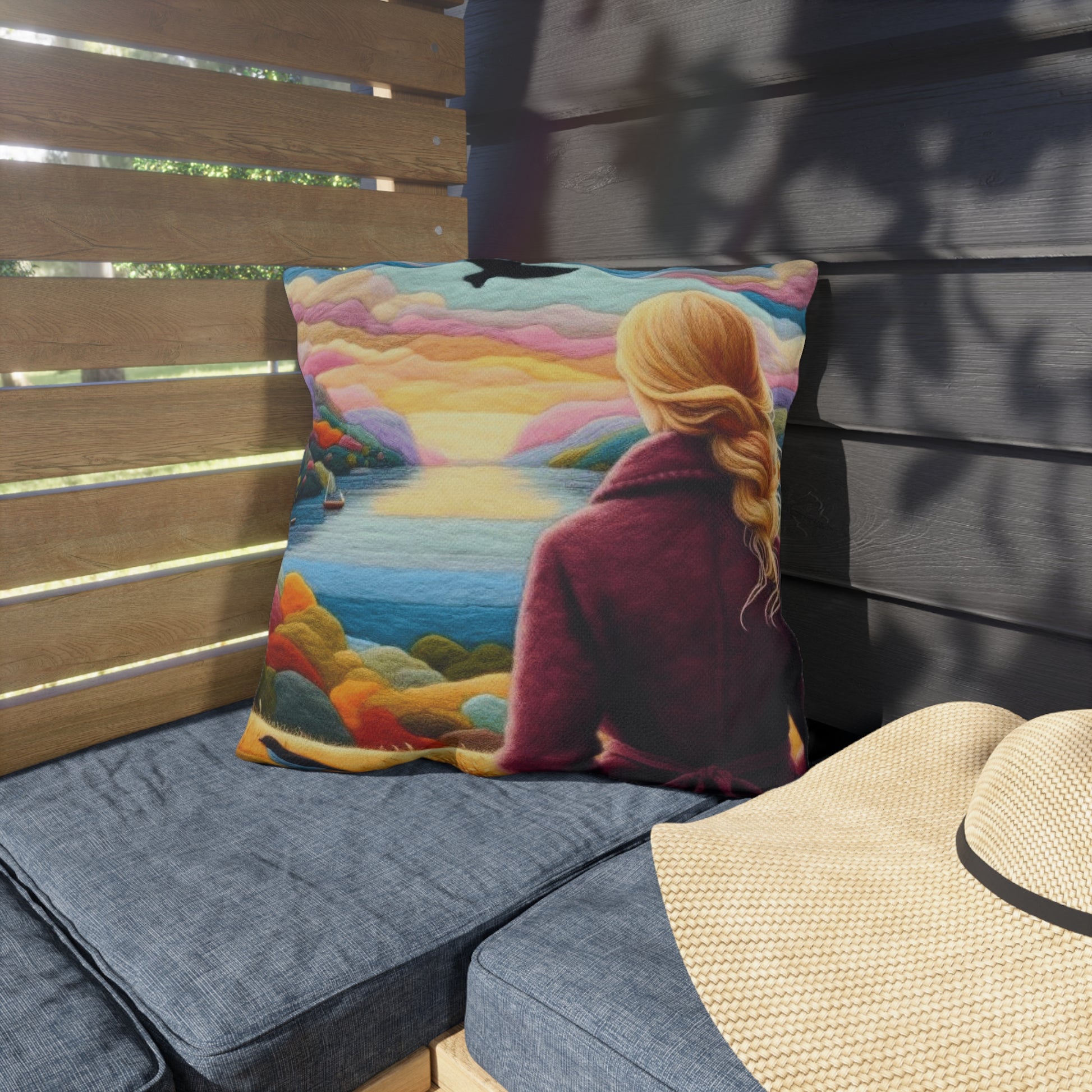 Scenic Lakeview Outdoor Pillow — Woman Overlooking Colorful Sunset Landscape